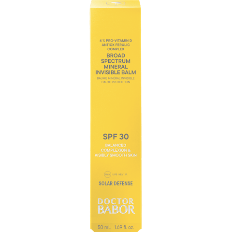 Sichtbare Ergebnisse stehen im Mittelpunkt jeder BABOR-Formel. Der DOCTOR BABOR SOLAR DEFENSE Broad Spectrum Mineral Invisible Balm SPF 30 wurde mit einem 100% mineralischen UV-Filter auf Basis von Zinkoxid formuliert, der SPF 30 bietet, und ist mit einem 4% Pro-Vitamin D Antiox Ferulic Complex angereichert. Der Balm hilft, sonnenbedingter Hautalterung vorzubeugen. Ectoin unterstützt den Schutz der extrazellulären Matrix (ECM) und hilft, den Kollagenabbau zu reduzieren – für ein sichtbar jugendlicheres Erscheinungsbild.